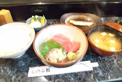 刺身定食 800えん(刺身、ご飯、副菜、味噌汁、お新香)